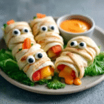 Creepy-Cute Mummy Veggie Wraps – Spooky, Healthy are fun, healthy snacks that resemble mummies. Made with whole grain tortillas, fresh vegetables, and a creamy filling, these wraps are perfect for Halloween parties or kids’ lunchboxes. You can customize them with various fillings like hummus, cream cheese, or guacamole. The key is to create a mummy appearance using strips of tortilla and small edible eyes to complete the look.