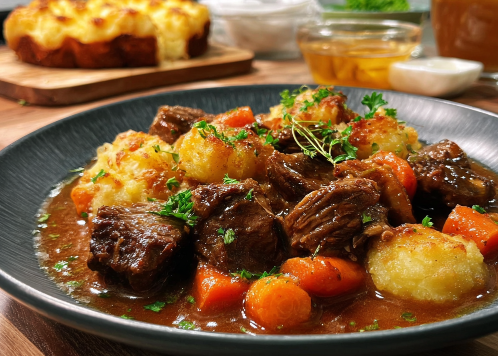 Indulge in the heartwarming flavors of Beef Stew with Potato Topping, a classic comfort dish that combines tender beef, vibrant vegetables, and a creamy potato layer. Perfect for chilly nights or family gatherings, this stew envelops your senses with its rich aroma and satisfying taste. Delight in each savory bite, making it a meal everyone will love.