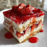 A No Bake Strawberry Jello Lasagna Recipe That Will Wow You is a layered dessert made without baking, featuring layers of creamy cheese filling, strawberry-flavored gelatin, and fresh strawberries.
